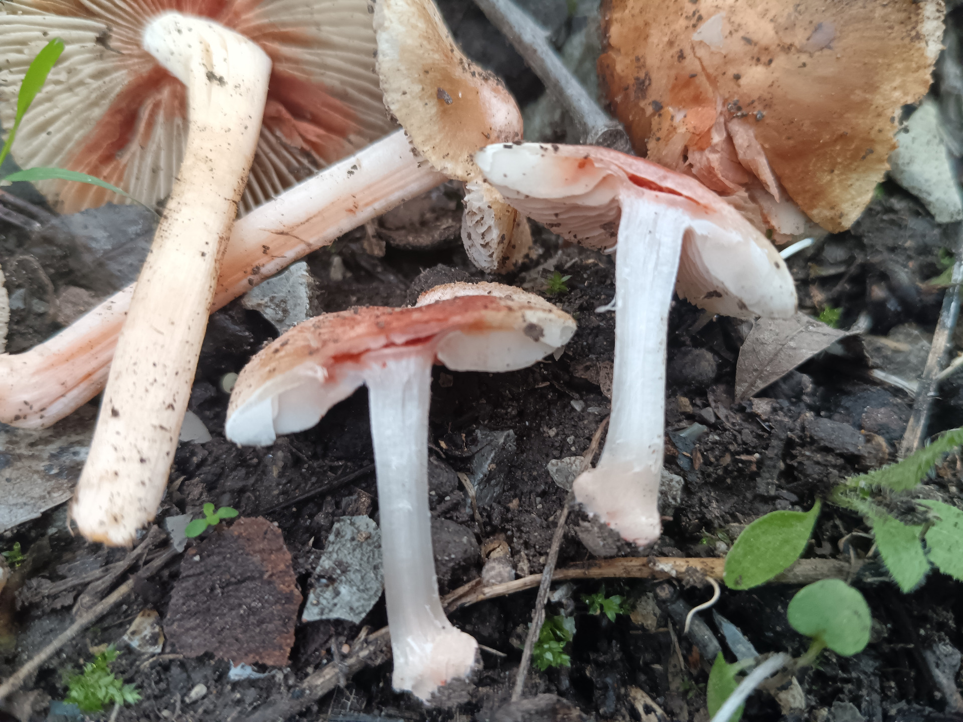 - Lames : blanchâtres au début, puis grisâtres, se tâchant par endroits de rouge-orangé, très net.
